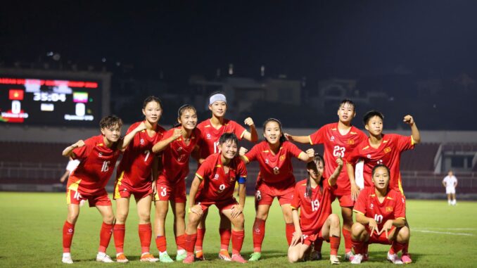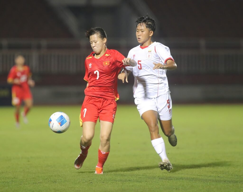 Myanmar started energetically, leveraging their superior fitness and launching fast-paced attacks to press Vietnam’s defense. Goalkeeper Le Thi Thu and the Vietnamese backline had to stay alert, particularly early in the match when Myanmar’s Sandar Lin nearly scored with a dangerous strike, only to be denied by a crucial save.