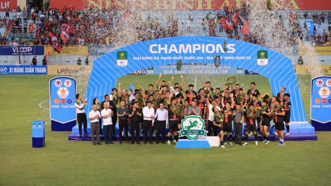 Ninh Binh, 14 June, 2025 – Phu Dong Ninh Binh officially lifted the 2024/2025 Gold Star V.League 2 title at home in Round 21 after a convincing 3-0 win over second-placed Truong Tuoi Binh Phuoc. On a day of celebration, coach Nguyen Viet Thang’s men turned the championship ceremony into a goal-scoring party, further extending their unbeaten streak and creating distance in a thrilling battle for the second-place play-off spot.