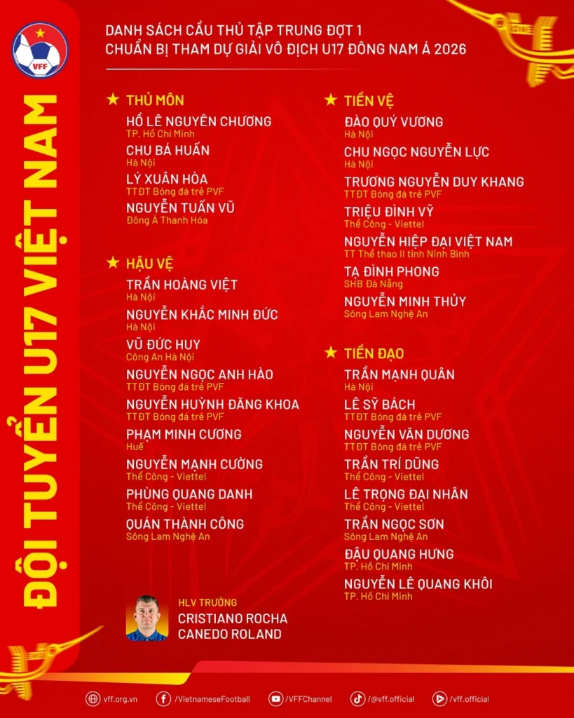 Furthermore, the coaching staff has introduced new faces including Vu Duc Huy from Hanoi Police FC, Phung Quang Danh of The Cong Viettel, and Ta Dinh Phong from Da Nang. These additions are aimed at increasing squad depth and creating healthy competition for places. With a balanced mix of experience and emerging talent, Vietnam U17 is shaping up as a strong contender as they gear up for a busy and ambitious 2026 campaign.